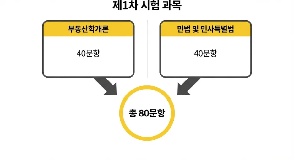 공인중개사 1차 시험은 부동산학개론과 민법 및 민사특별법 두 과목으로 구성되어 있어요.